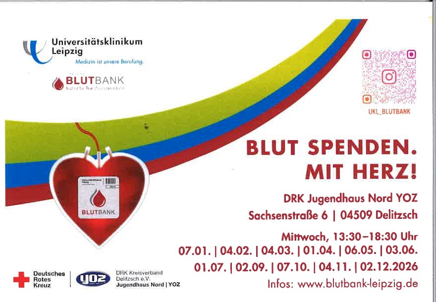 Die Blutbank des Leipziger Universitätsklinikums macht im DRK-Jugendhaus Nord (YOZ) in der Sachsenstraße 6 von 13:30 bis 18:30 Uhr Station. Eine Terminvereinbarung ist nicht erforderlich. Sie können während der Öffnungszeit zur Spende kommen.