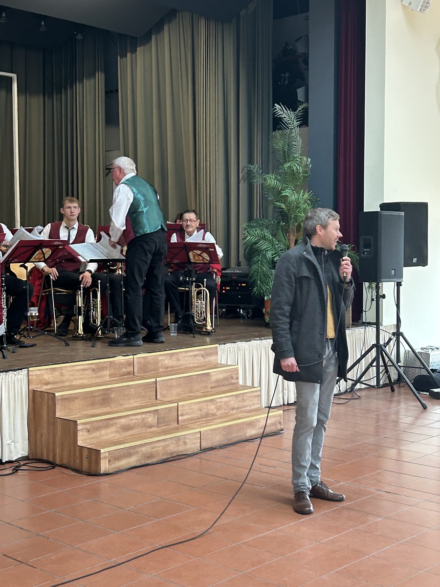 Wie in den Vorjahren auch, war auf unsere Mitglieder Verlass. So bildeten sich ab 9.30 Uhr am Bürgerhaus kleine Grüppchen im Gespräch vertieft. Pünktlich um 10.00 Uhr wurde die Festveranstaltung mit zwei kurzen Eröffnungsreden, draußen und drinnen, vom Vorstand Herrn Schulz eröffnet. Das Publikum war begeistert und spendete regen Beifall. Im Anschluss bedankte sich der Vorstand bei den Mitarbeiterinnen und Mitarbeitern für die geleistete Arbeit.