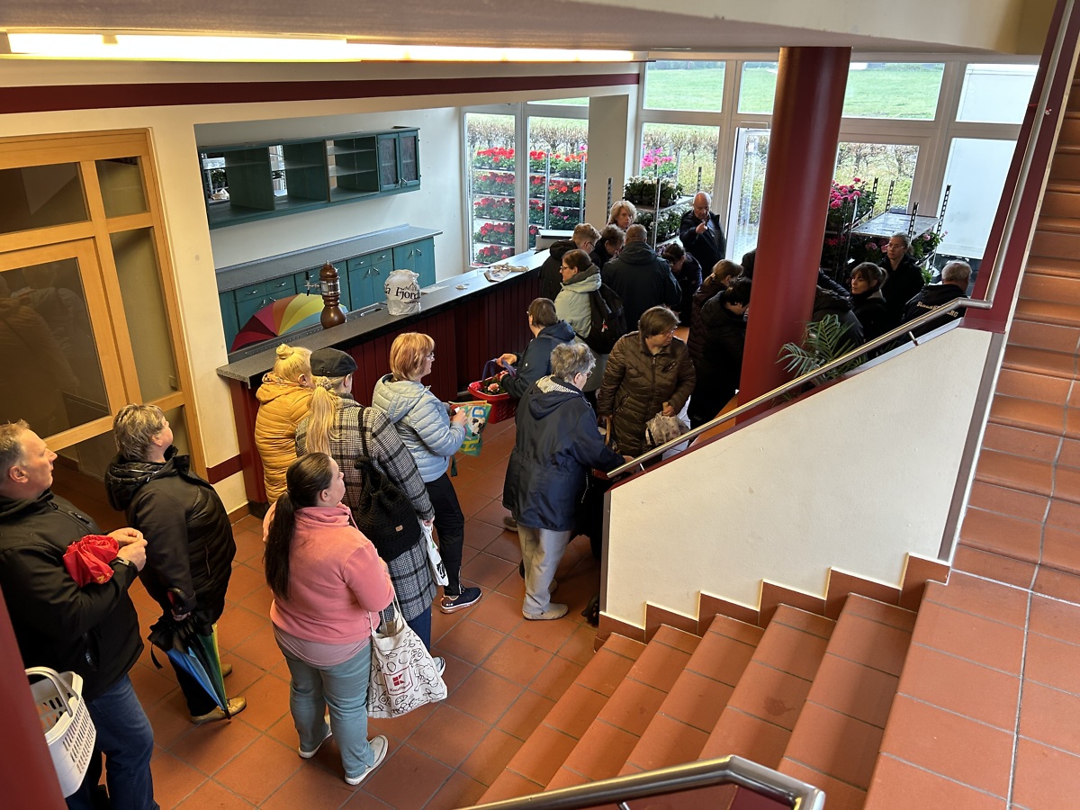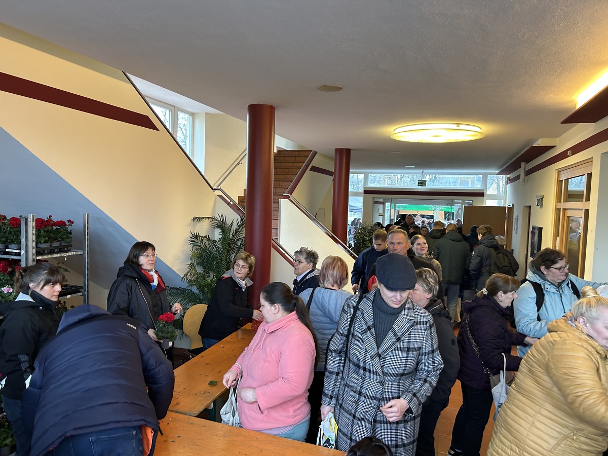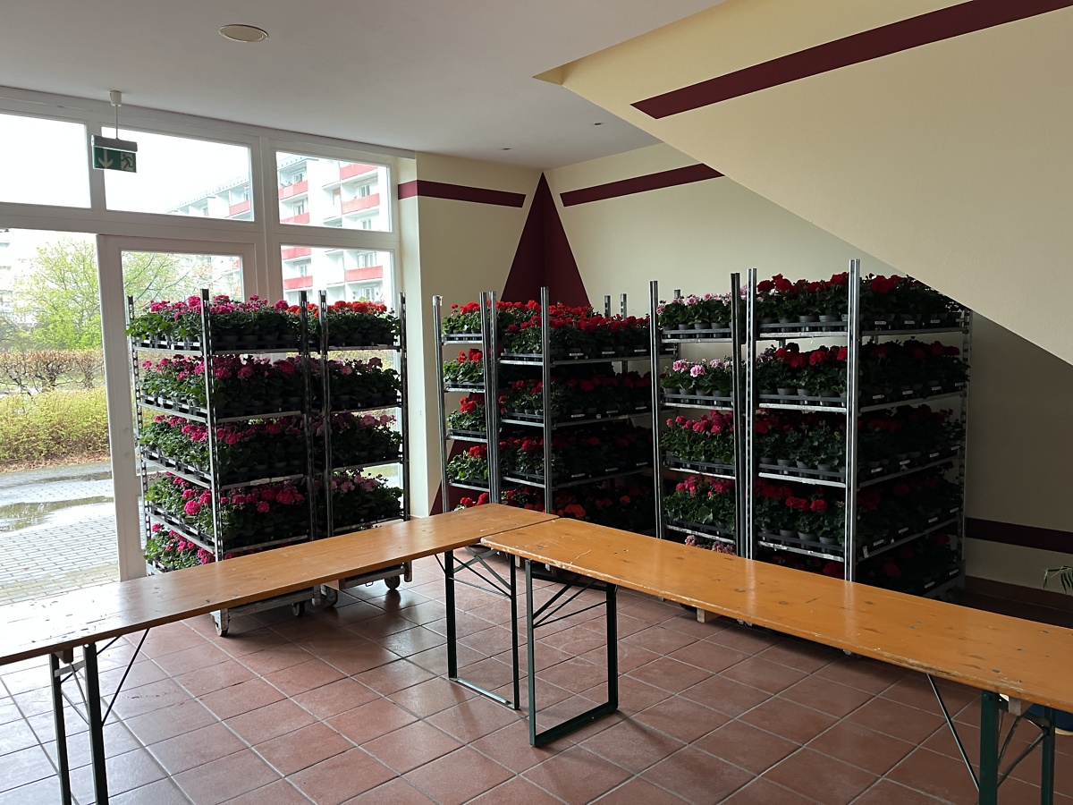 Das 3-köpfige „Team Transport“ machte sich gut gelaunt auf den Weg um die heißbegehrten Blumen zu laden. Drinnen wurde letzte Hand an den Blumenausgabestand gelegt.