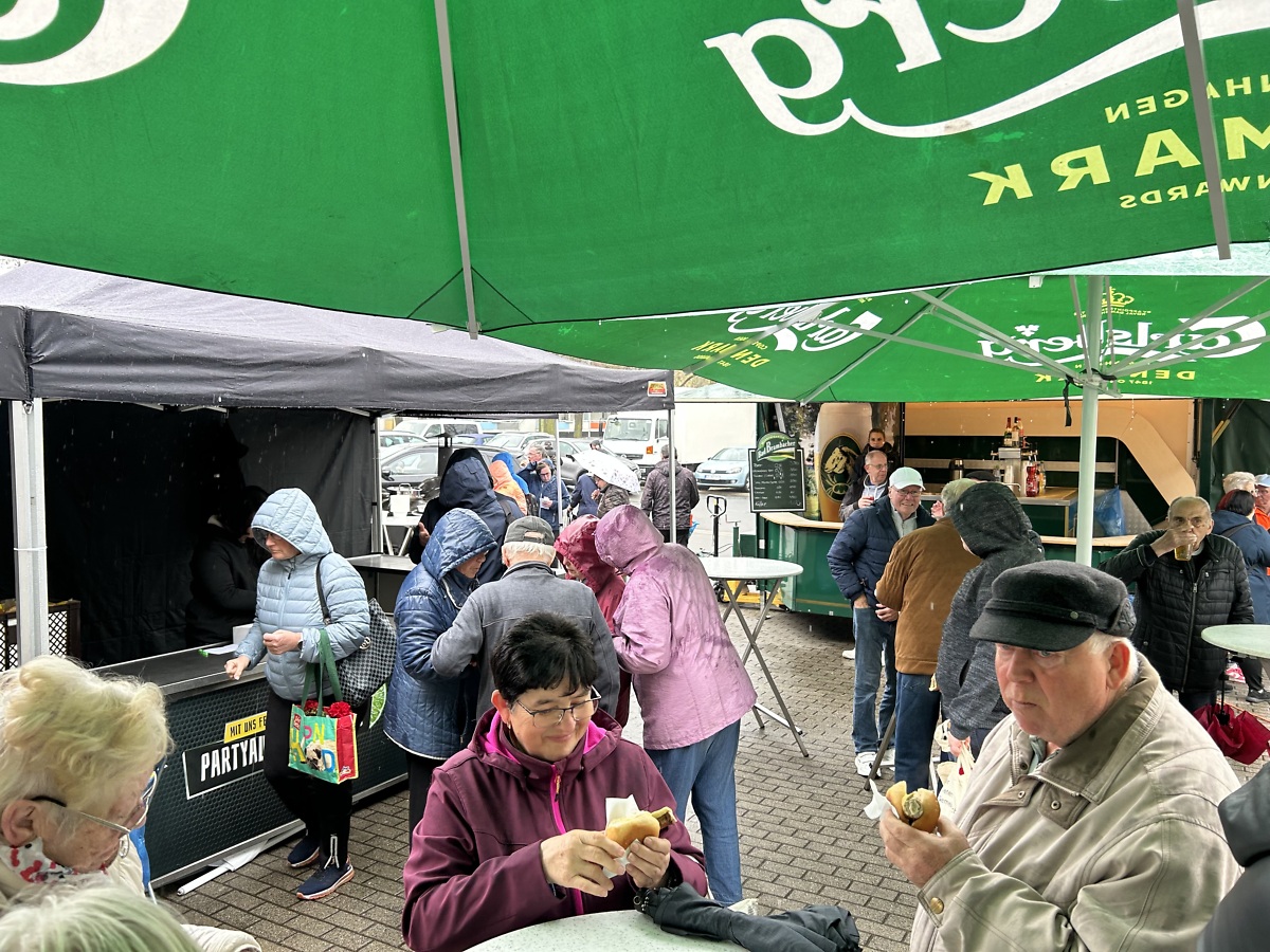 Wie pflegte mein Vetter Hein, der Einbeinige stets zu sagen: "Bei schönem Wetter kann jeder feiern." So herrschte dann auch ab 7.00 Uhr emsige Betriebsamkeit unter den Helfern vor Ort am Bürgerhaus, um alles für das Blumenfest aufzubauen. In Rekordzeit wurde der Saal mit Stühlen und Tischen versehen und die Bühne für den Blasmusikverein Schenkenberg e.V. vorbereitet. Derweil wurde draußen die Getränke- und Verpflegungsstrecke ausgerichtet und der Grill angefeuert. Tische und Zelte in direkter Nähe gaben Unterschlupf bei dem Nieselregen.