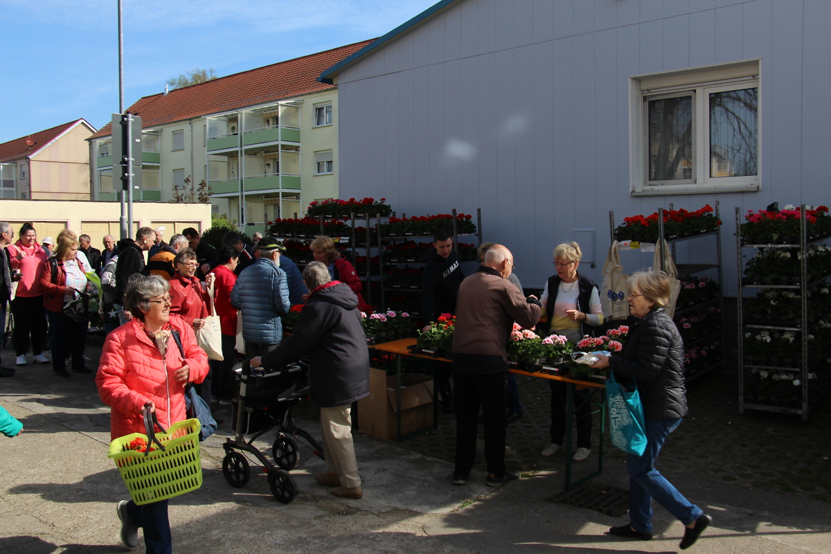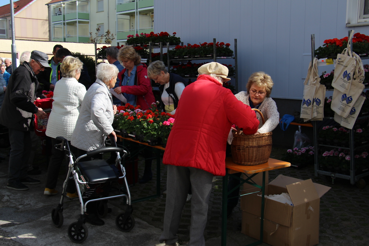 Viele Mitglieder sind unserer Einladung gefolgt und so bildete sich ab 9.00 Uhr schon eine Schlange vor dem Geschäftsgebäude. Nach der offiziellen Eröffnung, die mit einem Augenzwinkern unter dem Motto des Tages „WBG – Wir Bringen Geranien“ erfolgte, wurden die farbenprächtigen Geranien durch unsere Mitglieder in Empfang genommen.